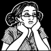 Description: A girl leans forward to speak past a curtain, looking friendly but kind of intense.